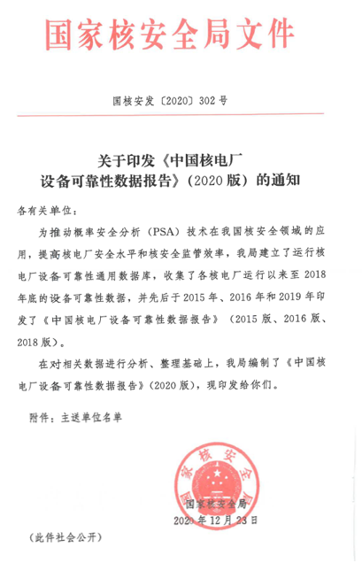 近日,中心負(fù)責(zé)編制的《中國(guó)核電廠設(shè)備可靠性數(shù)據(jù)報(bào)告》(2020版)(以下簡(jiǎn)稱2020版報(bào)告)由國(guó)家核安全局正式發(fā)布(國(guó)核安發(fā)[2020]302號(hào))。