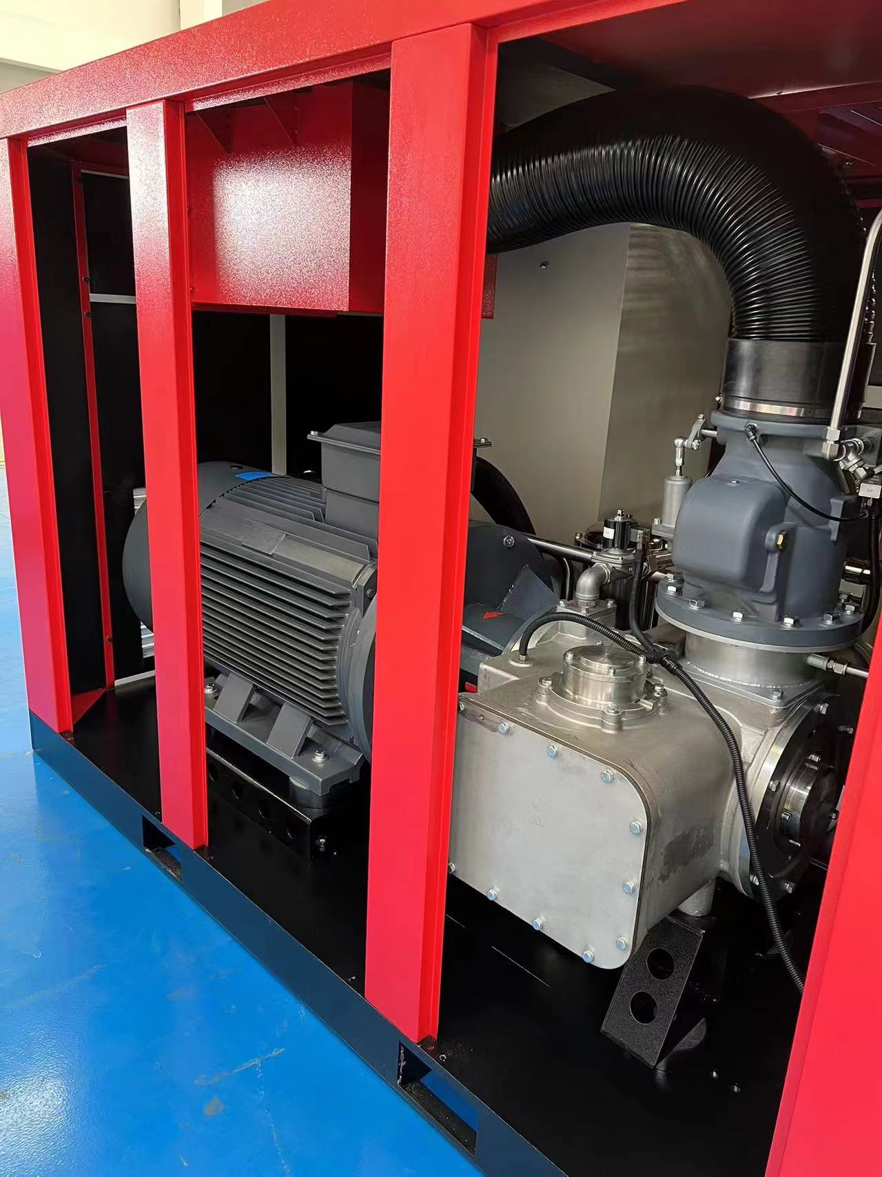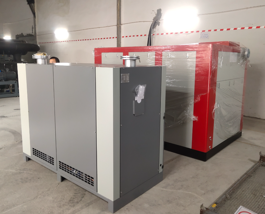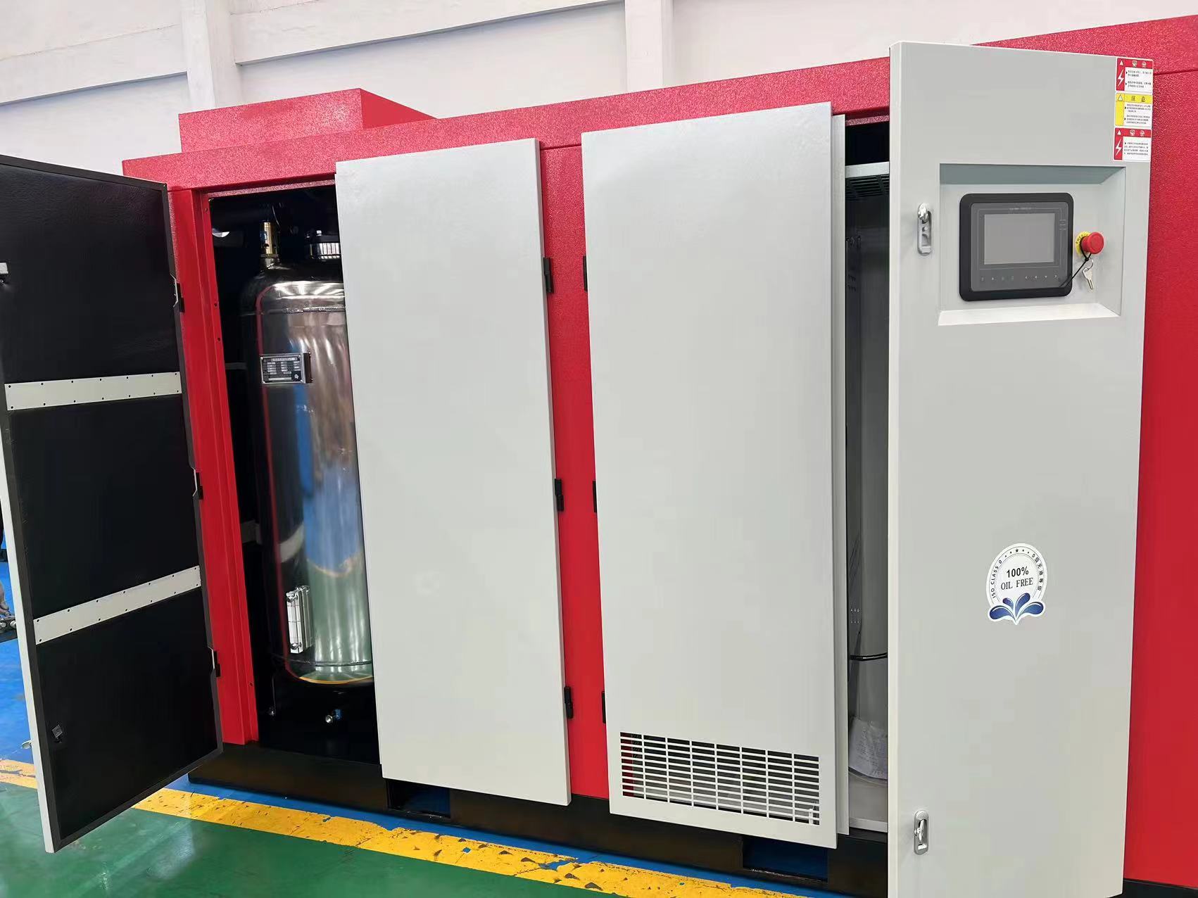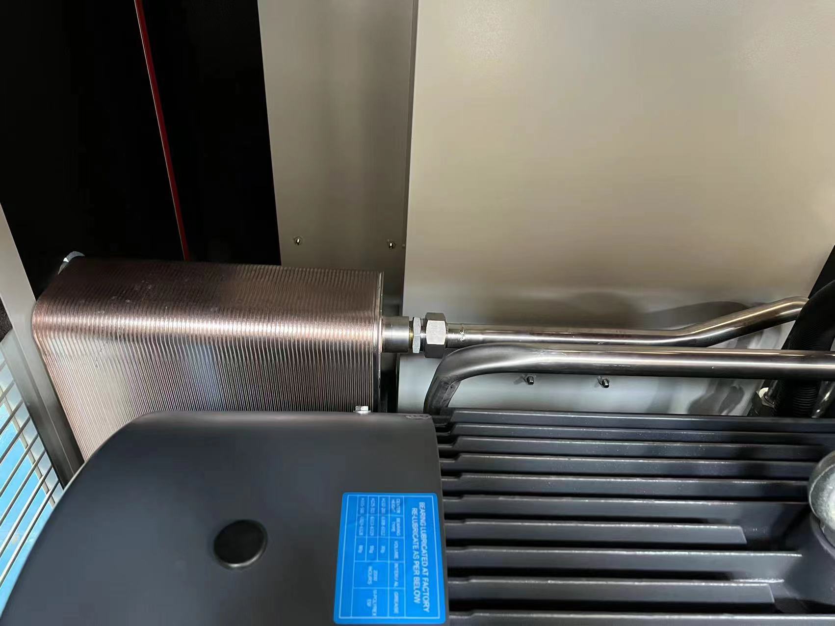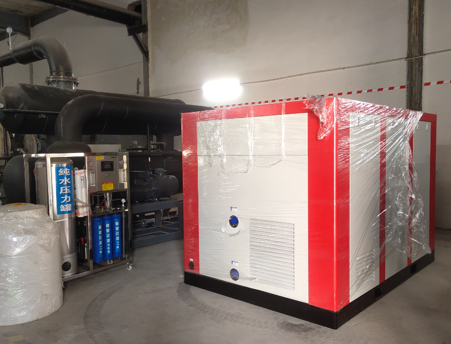 某紡織公司空壓機節(jié)能項目:因公司生產(chǎn)需要,增加一套200kw水潤滑永磁變頻螺桿式空壓機,增加了機房的空間環(huán)境,對機器的運行、散熱、維修維護的方便性都有很大的效率,提高節(jié)能效果。